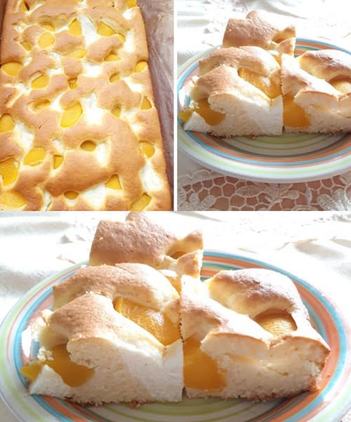 Połowę ciasta wylej na blaszkę. Rozłóż równomiernie twaróg i na wierzch połóż brzoskwinie. Zalej resztą ciasta – nie musi całkowicie przykrywać owoców.