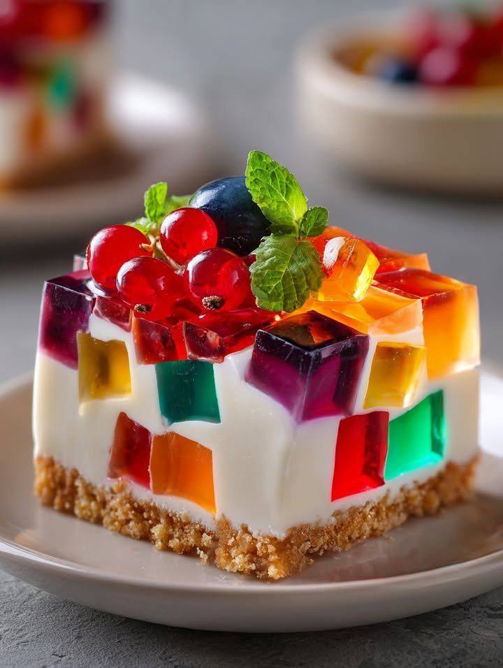 Ten kolorowy, świeży sernik to nie tylko pyszny deser, ale i efekt wizualny! Jego kremowe, delikatne nadzienie, zwieńczone kolorowymi kostkami galaretki, jest po prostu przepyszne: idealne na przyjęcia, specjalne okazje lub kameralne spotkania rodzinne.