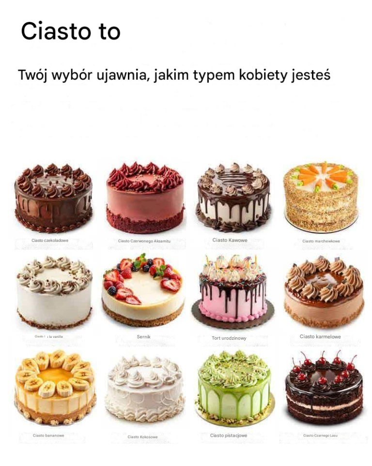 Tort to nie tylko deser; to słodkie odzwierciedlenie Twojej osobowości. Niezależnie od tego, czy pociąga Cię bogactwo czekolady, nostalgia tortu urodzinowego , czy kapryśny urok ciasta bananowego, każdy smak opowiada o Tobie historię.