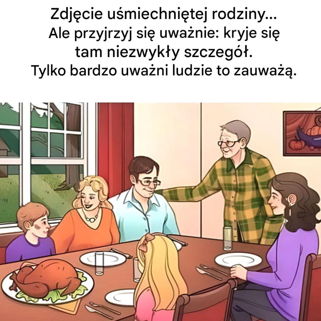 Wyobraź sobie ciepłą i przyjazną scenę: duży stół, śmiech, złocisty pieczony kurczak pośrodku i cała rodzina zgromadzona wokół pysznego posiłku. Atmosfera wydaje się idealna. A jednak drobny szczegół wszystko psuje. W obraz wkradła się wizualna anomalia... Czy potrafisz ją szybko dostrzec? Iluzja jest na tyle subtelna, że pozostaje niezauważona nawet przez uważne oko.