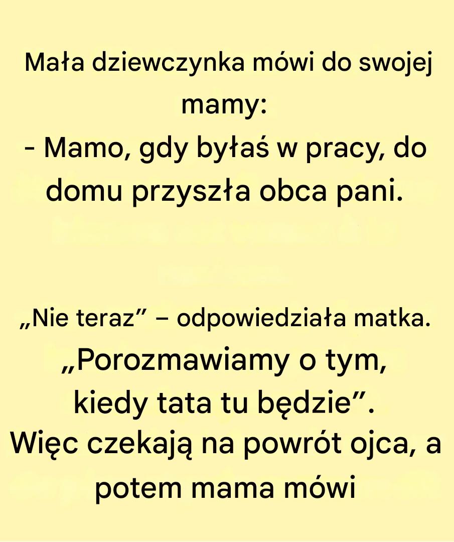 Niewinna dziewczynka siada przy stole i z figlarnym uśmiechem wypowiada zdanie, które zakłóci spokój jej rodziny: „Mamo, kiedy byłaś w pracy, do domu przyszła obca pani”. Choć to stwierdzenie wydawało się nieszkodliwe, w rzeczywistości kryje w sobie o wiele więcej, niż się wydaje. Mama, pochłonięta swoimi obowiązkami, natychmiast zastyga w bezruchu. Obca pani? Ta wzmianka budzi podejrzenia, ale mama woli odłożyć rozmowę na przybycie taty.