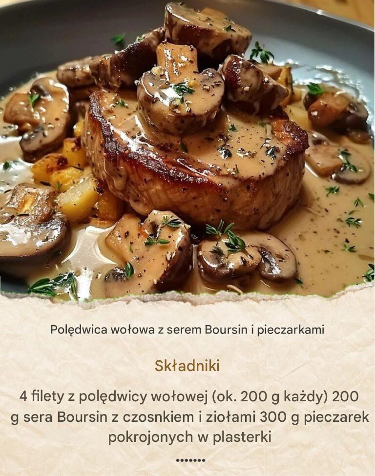 ser boursin z czosnkiem i drobnymi ziołami. Grzyby guzikowe i szalotki dodają odrobinę ziemi i słodyczy, podczas gdy białe wino przynosi nutę świeżości. To proste w przygotowaniu danie jest idealne na specjalną okazję lub aby zaimponować podczas kolacji ze znajomymi.