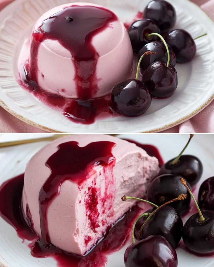 Podczas gdy krem się chłodzi, mieszanina musu wiśniowego, miksując 300 g wiśni z sokiem z cytryny w robocie kuchennym lub blenderze do uzyskania mieszaniny wymaganej. Przetrzyj mus przez drobne sito, aby usunąć resztek i uzyskać dostęp. Delikatnie wmieszaj mus wiśniowy do ostudzonego kremu, aż do dokładnego połączenia.