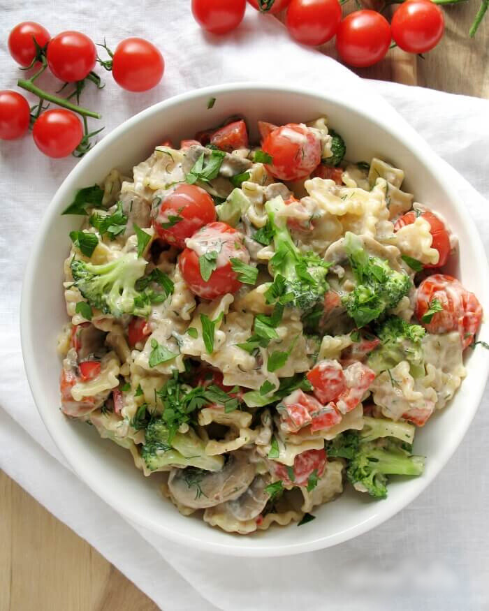 Makaron z dużą ilością warzyw, pieczarek i wegańskim, kremowym sosem na bazie nerkowców. Danie jest przepyszne, łatwe i zdrowe, a do tego prezentuje się całkiem wykwintnie, dlatego pasuje na co dzień jak i na specjalne okazje.