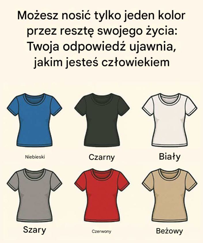 Obraz przedstawia sześć prostych opcji – niebieski, czarny, biały, szary, czerwony i beżowy – każda reprezentowana przez prostą koszulkę. Minimalistyczny design, żadnych rozpraszających elementów. Tylko kolor i wybór. I o to właśnie chodzi.