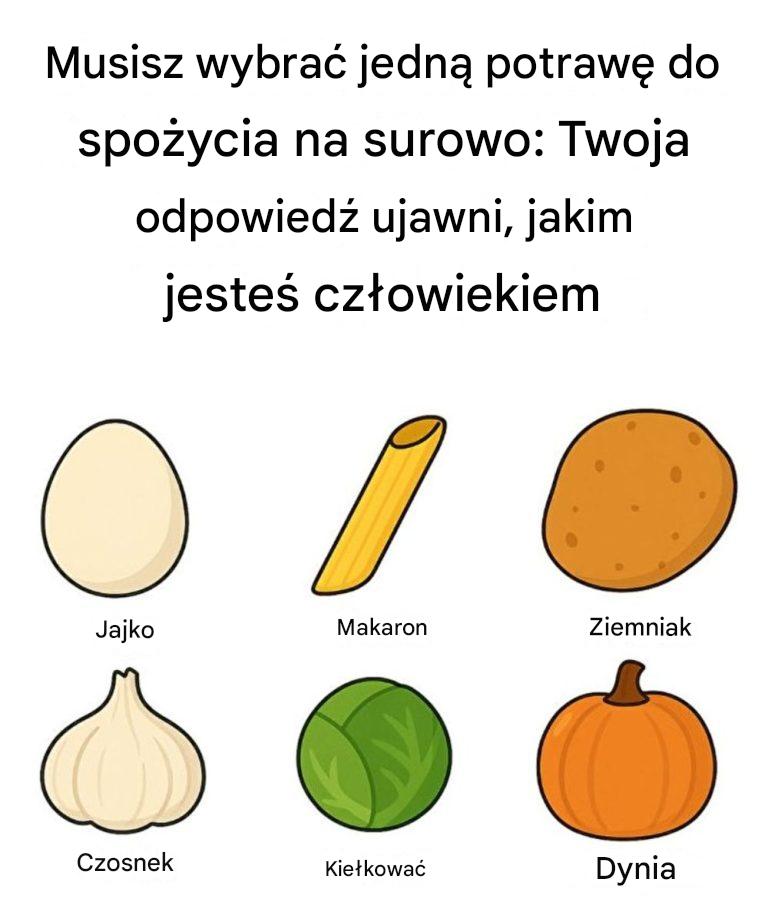 Czasami najprostsze pytania ujawniają najbardziej zaskakujące prawdy. Wyobraź sobie, że musisz wybrać jeden z tych produktów do spożycia na surowo: jajko, makaron, ziemniak, czosnek, kiełki lub dynię.