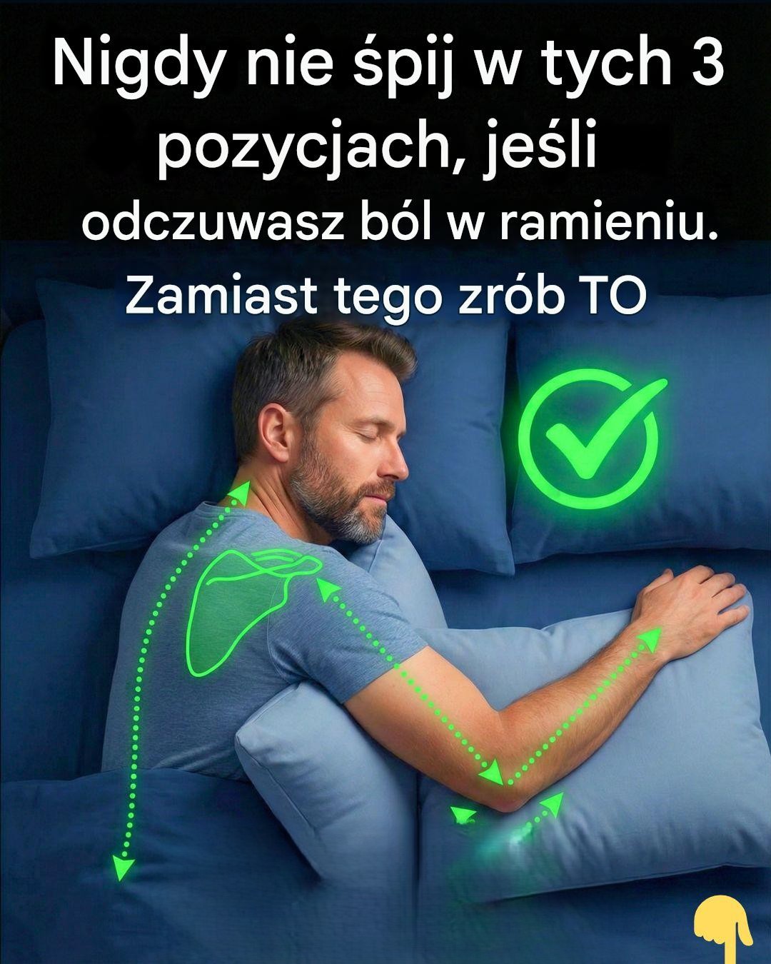 Spanie na przeciwnej (nieuszkodzonej) stronie wydaje się naturalnym wyborem, ale kryje się w tym pułapka: większość osób krzyżuje obolałe ramię z przodu lub obraca je do wewnątrz (wyobraź sobie ramię opadające do przodu na klatkę piersiową lub spoczywające na poduszce).