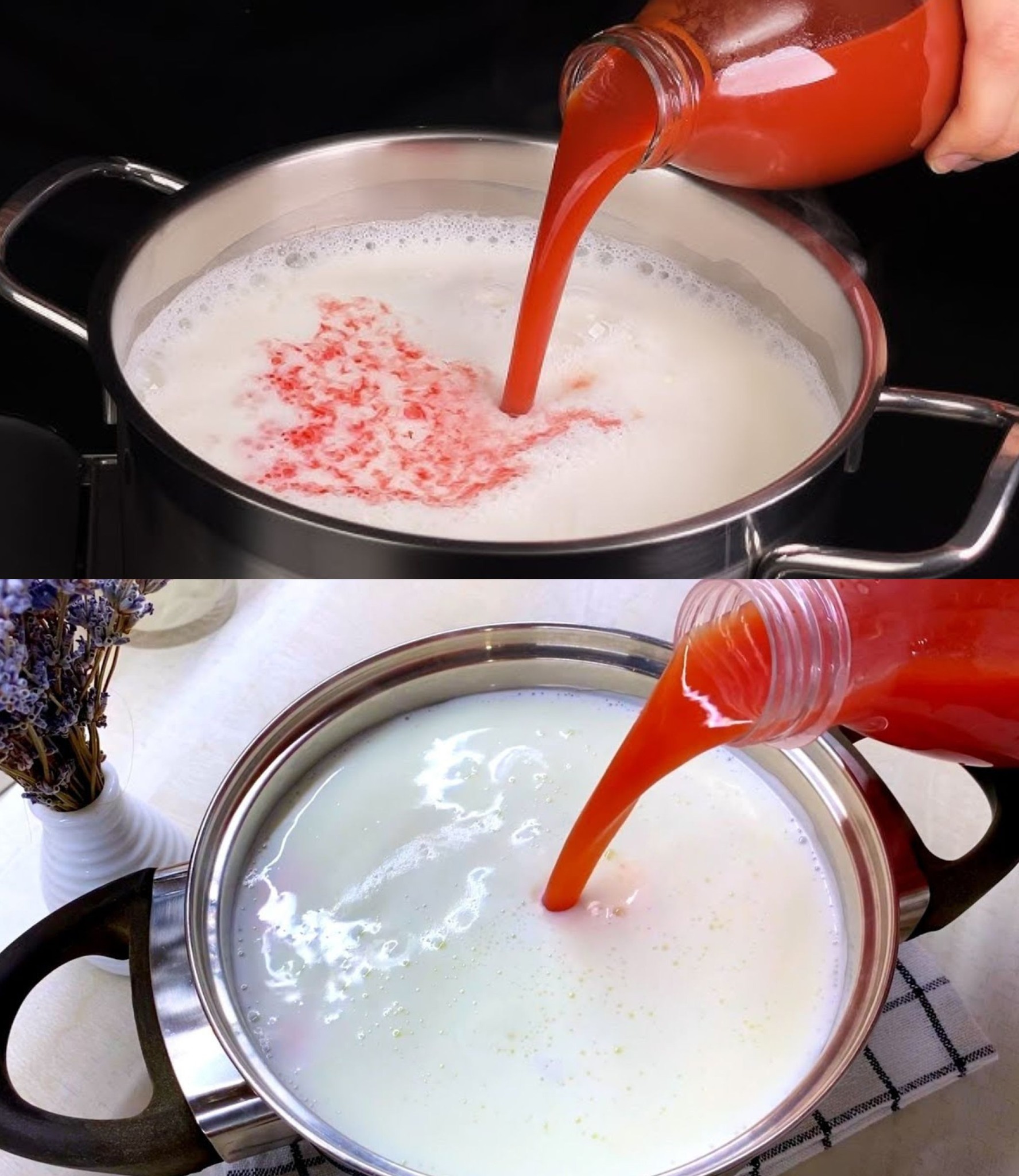 Gdy mleko zacznie się gotować, dodać sok pomidorowy, delikatnie mieszając. Zobaczysz, że mleko zaczyna się zsiadać, co jest całkowicie normalne.