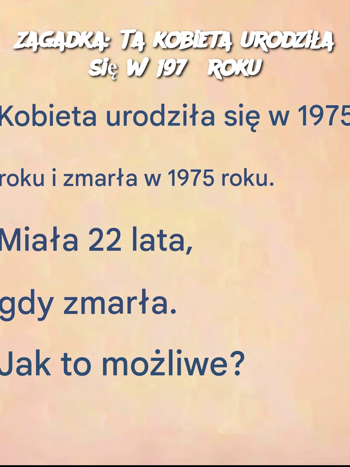 Czy właśnie przeczytałeś? Wyobraź sobie: przeglądając kanał aktualności natrafiasz na nietypowe zdanie. „Kobieta urodziła się w 1975 roku i zmarła w 1975 roku. Miała 22 lata. To zatrzymać cię w miejscu. Niezrozumiały? Niepokojące? Oczywiste jest, że trochę jest pułapka… Ale gdzie? trzymaj się, bo ta zagadka zastosowania na naszej logiki, nasze odruchy i wymaga odrobiny wyobraźni. A co jeśli kluczem jest właśnie to, aby nie w zwyczajny?